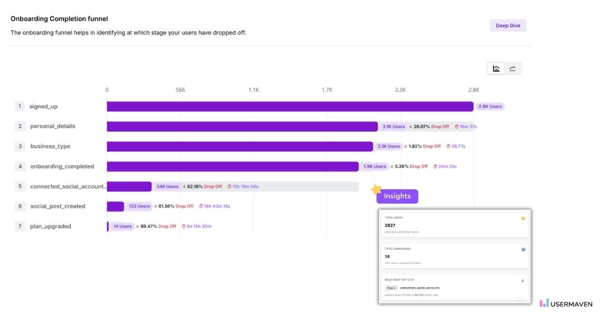 Conversion metricsConversion funnel rates, step-by-step drop-offFind bottlenecks and leaks